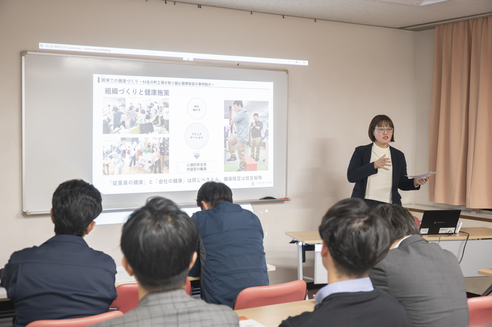 第二部では、従業員44名の町工場である株式会社スリーハイの健康経営の取り組みについて、徳江彩貴氏より事例紹介がありました。同社では「会社は人・もの・金で成り立つが、最も重要なのは“人”」との考えのもと、人への投資を重視し、健康づくりを経営戦略の一つとして位置付けています。安心して働ける職場環境を整えることで、生産性の向上や組織の安定、売上の向上につながるといいます。